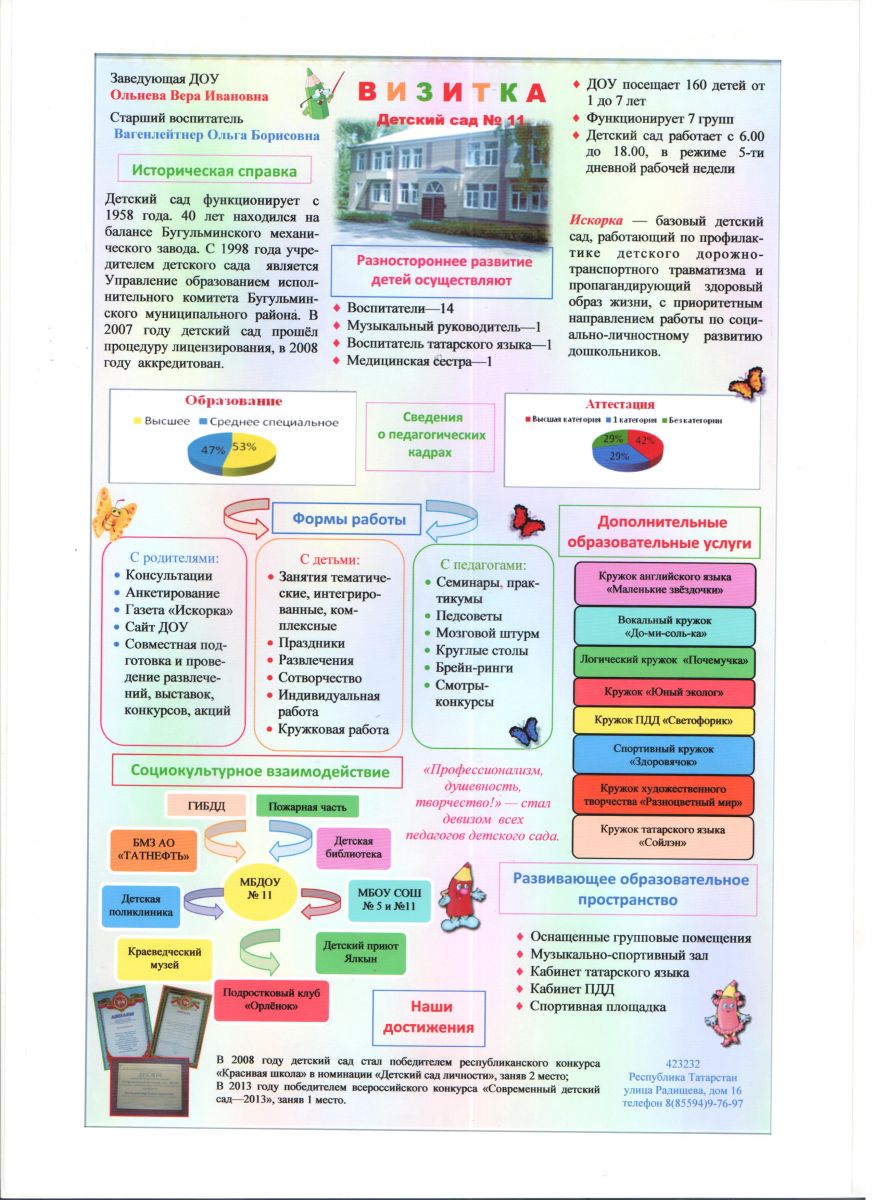 Муниципальное бюджетное дошкольное образовательное учреждение детский сад общеразвивающего вида № 11 "Искорка" Бугульминского муниципального района Республики Татарстан. Татарстан Республикасы Бөгелмә муниципаль районы мәктәпкәчә тәрбия һәм белем бирʏ муниципаль бюджет учреждениесе "Искорка" 11 нче гомʏм ʏсеш төрендәге балалар бакчасы.