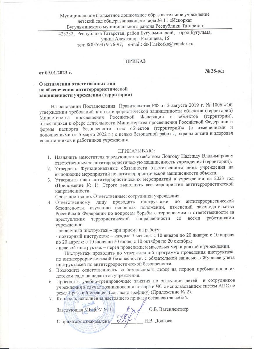 Приказ о назначении ответственного за антитеррористическую безопасность в ДОУ