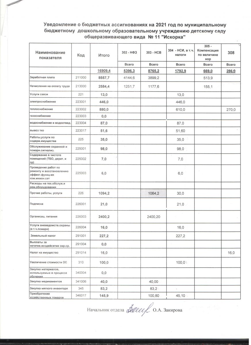 Уведомление о бюджетных ассигнованиях на 2021 год