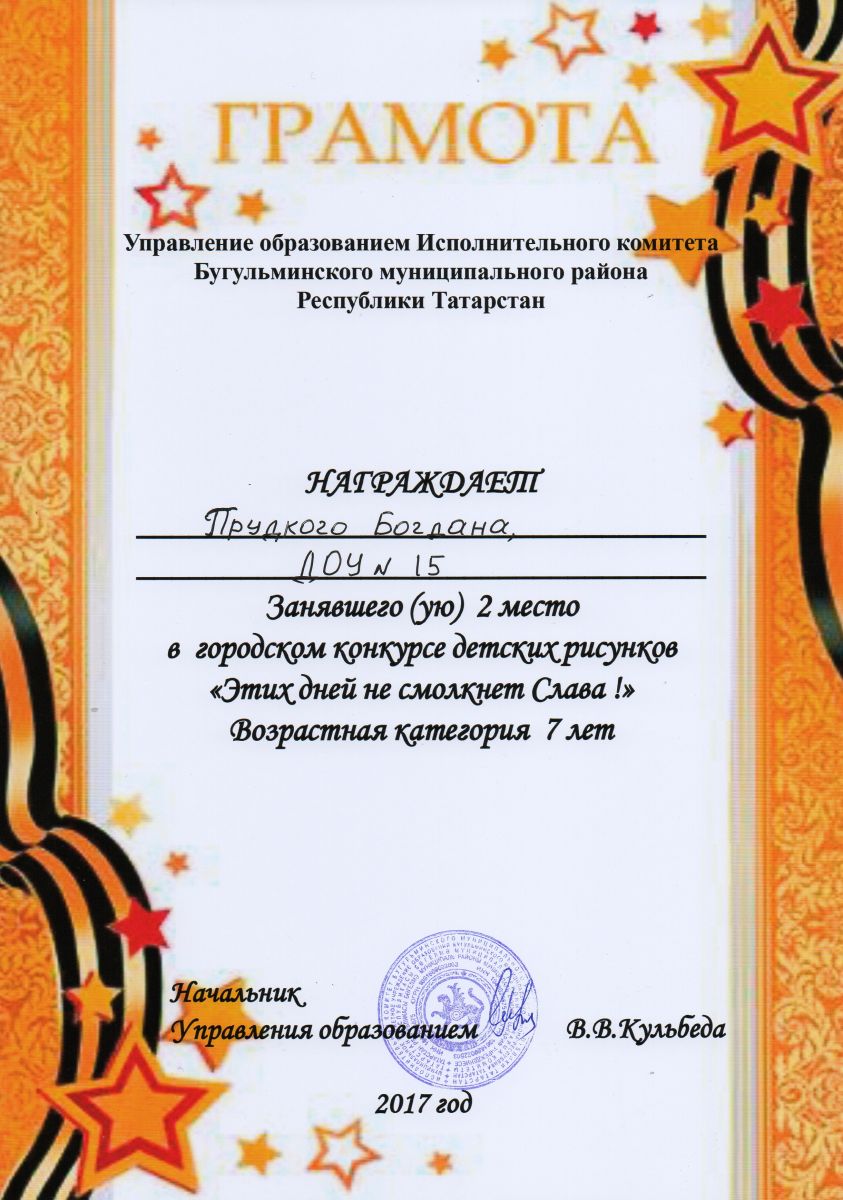 II место в конкурсе заняли - воспитанник подготовительной группы "Звёздочки" Прудкий Богдан (воспитатели: Асфандиярова Р.Р., Тихонова К.Б.) и воспитанник старшей группы "Почемучки" Лукьянов Илья (воспитатели: Андреева И.В., Губина Л.В.).