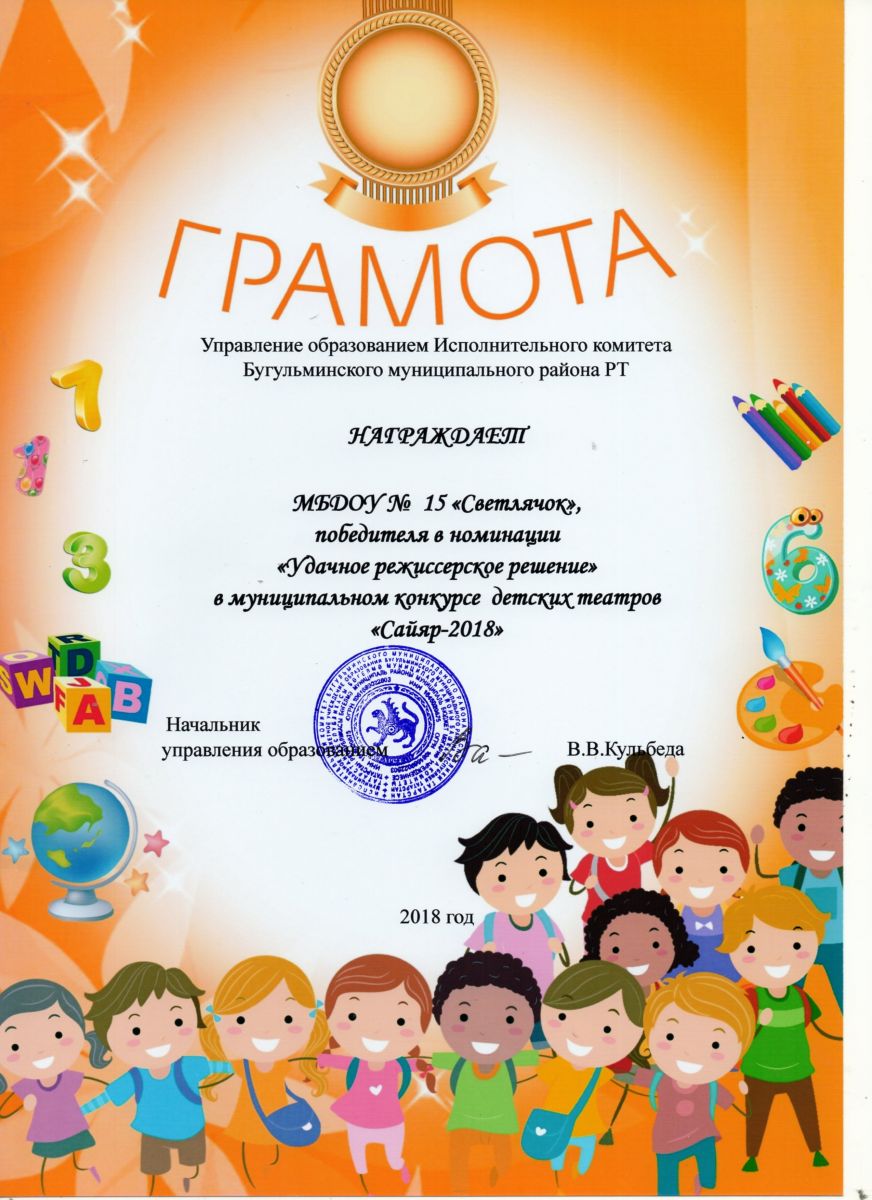 По итогам конкурса, наш детский сад стал победителем в номинации «Удачное режиссёрское решение», за что был награждён ГРАМОТОЙ.