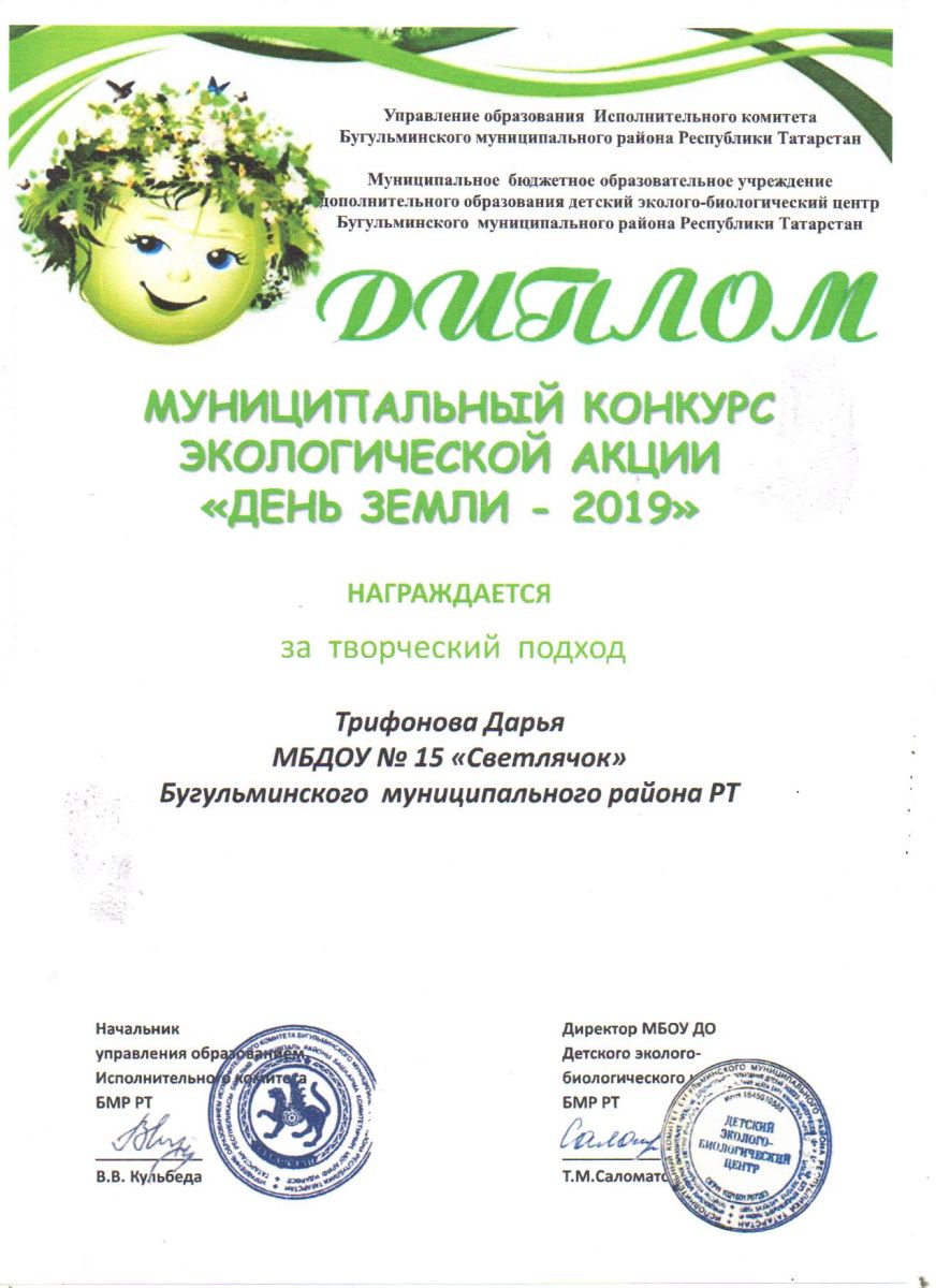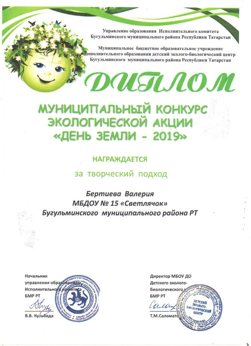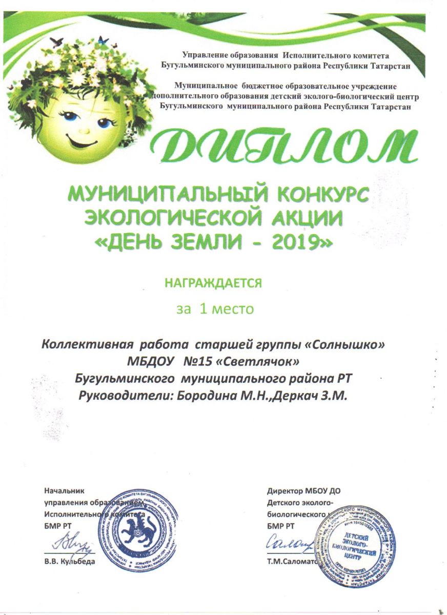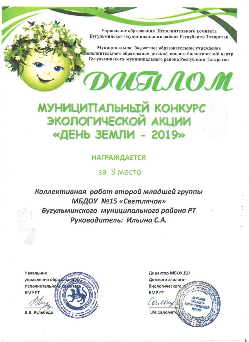 Опубликовано: 22.05.2019С целью привития навыков экологической культуры и расширения представлений о многомерности мира с 20 апреля по 7 мая 2019 года наш детский сад участвовал в экологической акции «День Земли-2019», по итогам которой наши педагоги и воспитанники получили:
