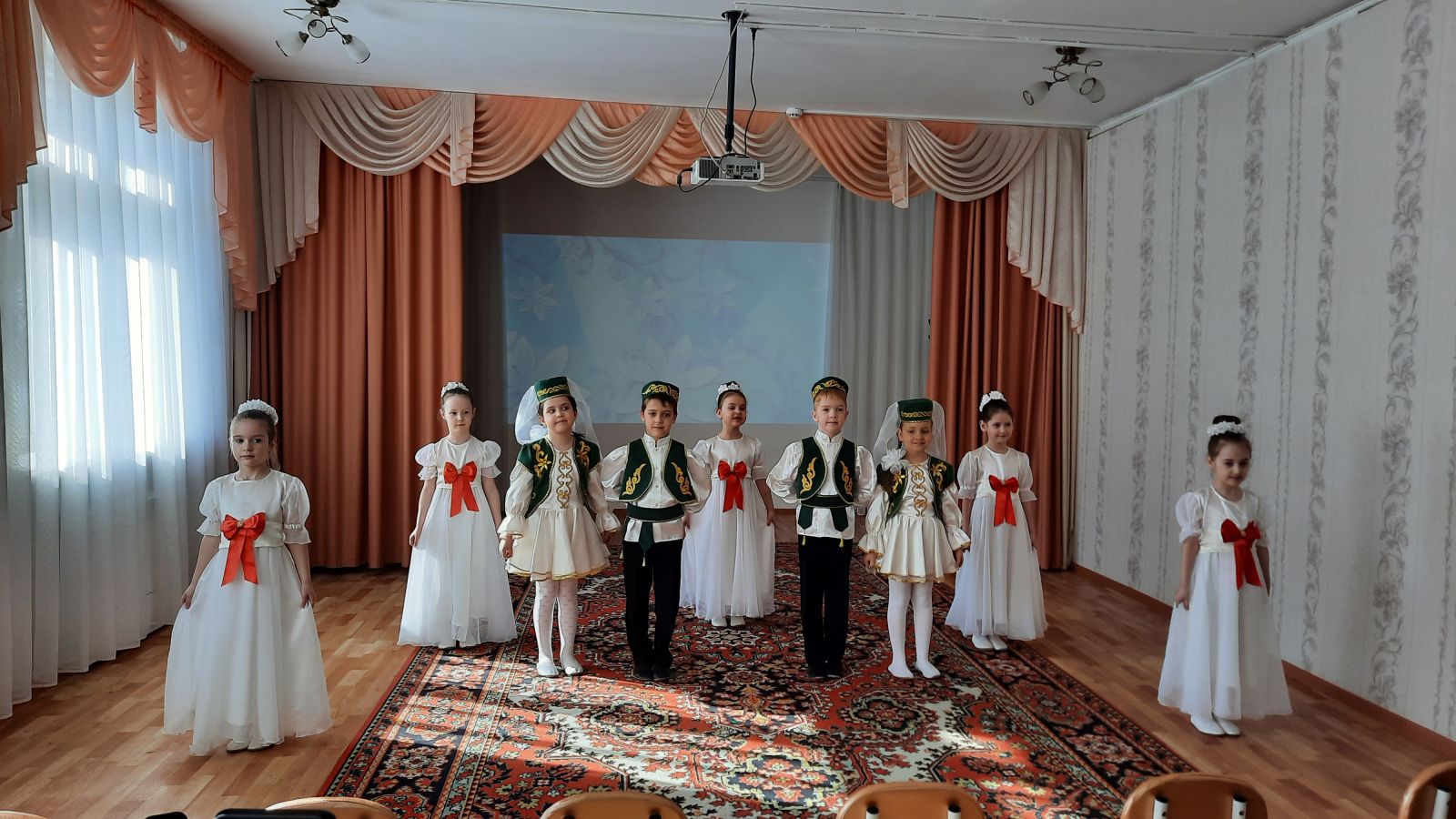 Воспитанники старшего дошкольного возраста под руководством музыкального руководителя Шарагиной Н.В. и воспитателя по обучению татарскому языку Бадреевой Э.И. поприветствовали гостей весёлой песней и танцем.