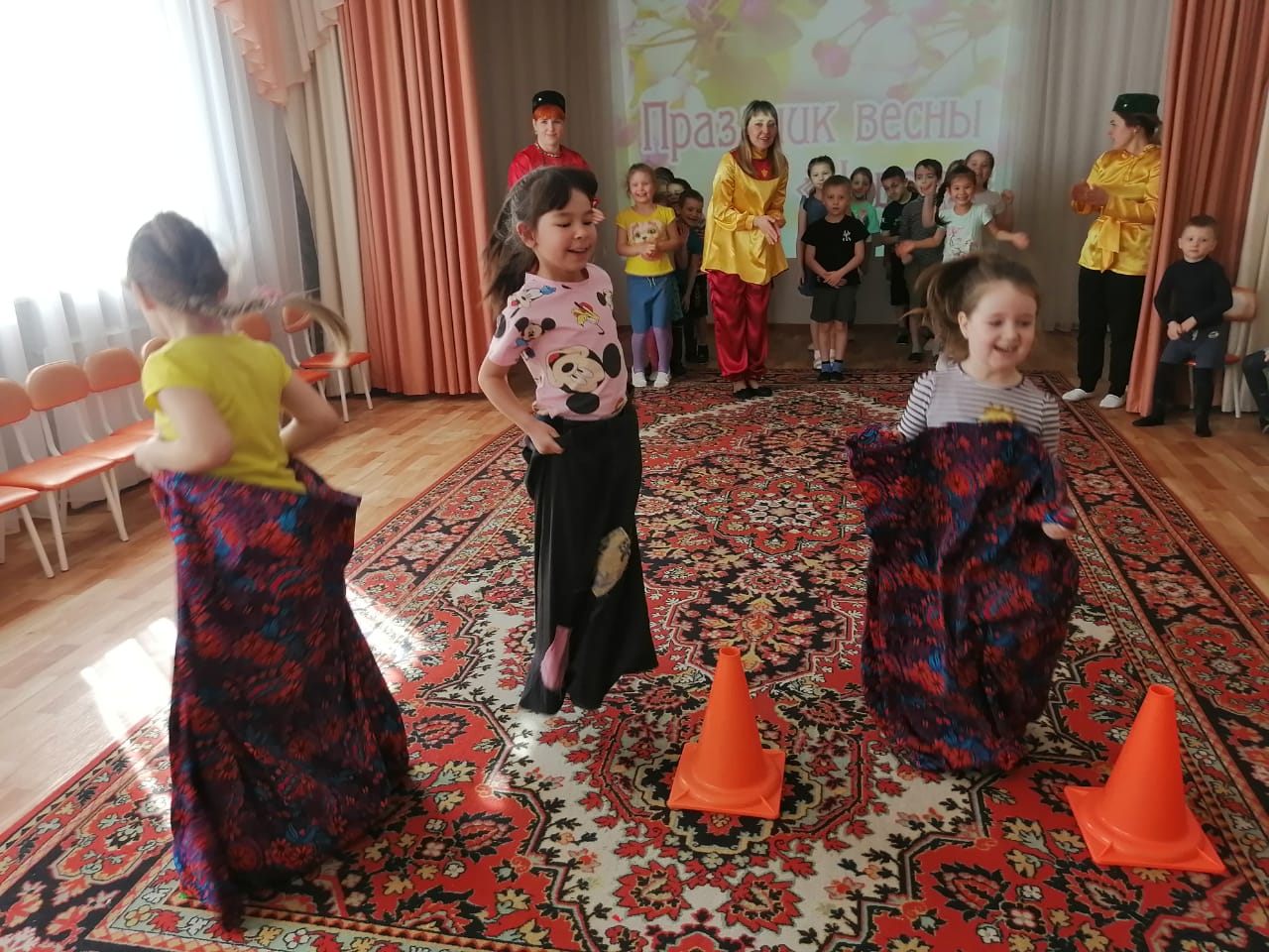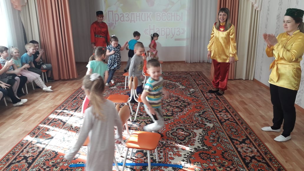 Конечно же не обошлось на празднике без состязаний! Сначала перетягивали канат, мерились силой, а затем – бег в мешках и бег с ложками. Воспитанники подготовительной группы исполнили танец с цветами «Навруз».
