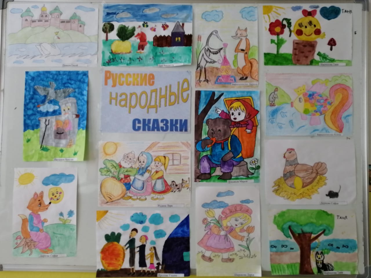 В группе организовали выставку рисунков на тему:" Русские народные сказки".