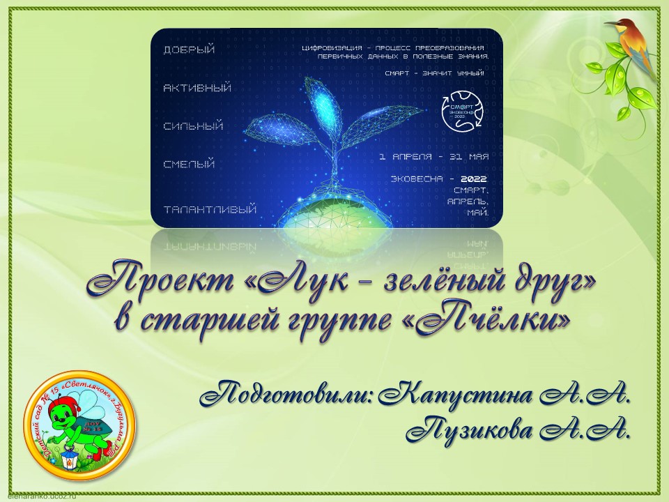 Опубликовано: 08.04.2022Краткосрочный проект "Лук — зелёный друг" в старшей группе "Пчёлки" в рамках республиканской акции #эковесна2022 представили воспитатели Капустина А.А., Пузикова А.А. (Смотреть презентацию!)