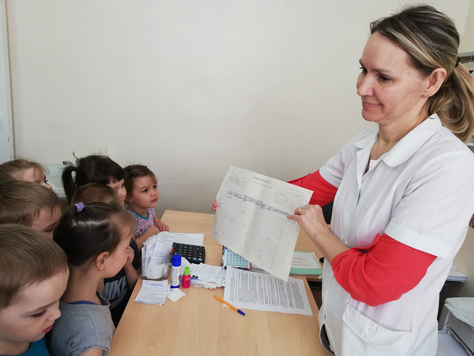 Очень интересной и познавательной стала экскурсия в медицинский кабинет. Наша медсестра Гульназ Минталиповна подробно рассказала детям, что такое меню, карточки детей, для чего они нужны, о предметах, которые нужны в работе.