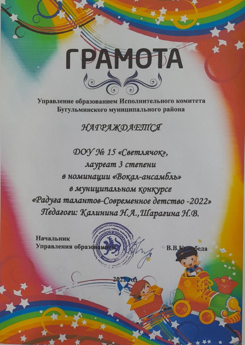 Опубликовано: 03.06.2022С 22 по 25 апреля 2022 года среди воспитанников дошкольных образовательных учреждений г. Бугульмы и Бугульминского муниципального района прошёл онлайн-фестиваль (Конкурс) «Радуга Талантов — 2022», посвящённый теме «Современное детство» с целью приобщения детей к современному искусству.