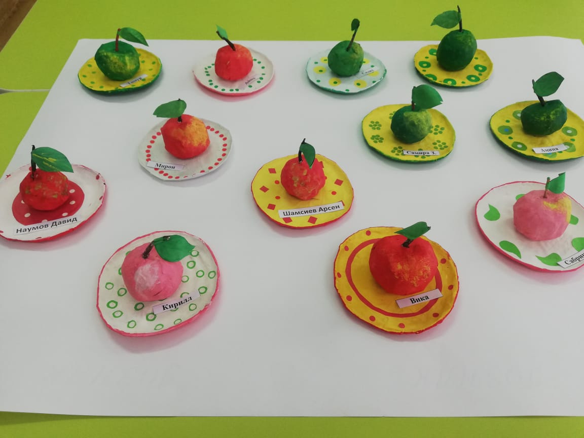 Подарки сувениры для мам, сделанные детьми группы "Ляйсан": папье-маше "Яблочки на тарелке".