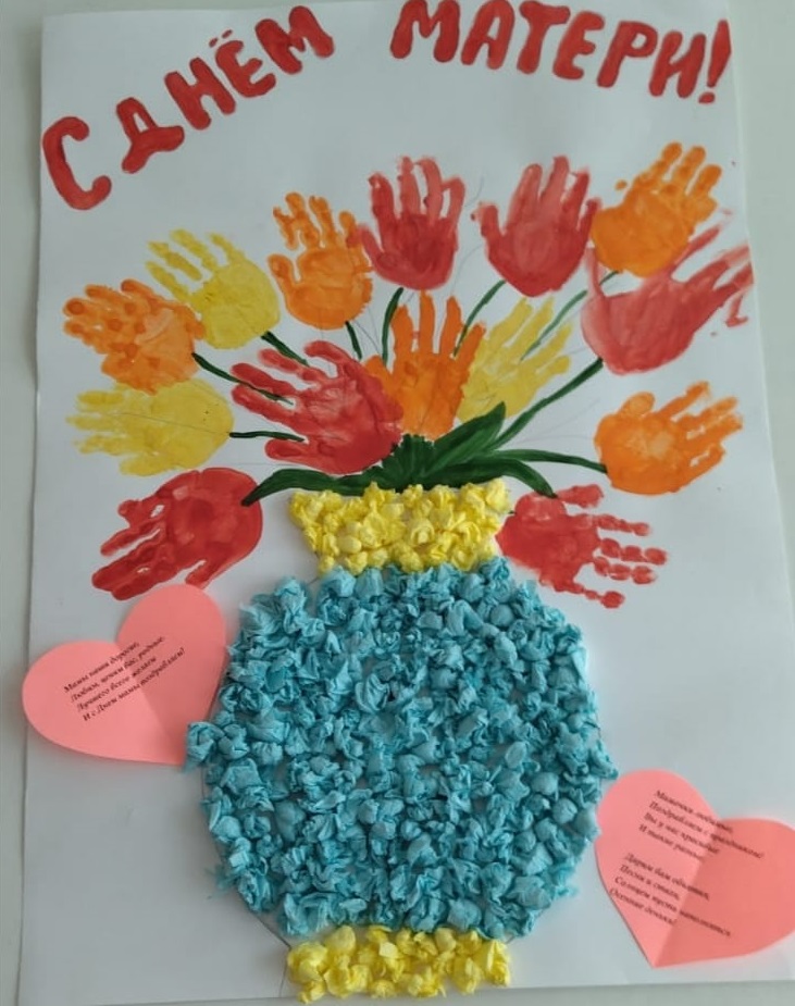 А ещё воспитанники совместно с педагогами приготовили подарки для своих любимых мам. Делая подарки, дети получили массу положительных эмоций. Равнодушным не остался ни один ребёнок. Каждый старался порадовать свою мамочку и делал подарки с любовью.