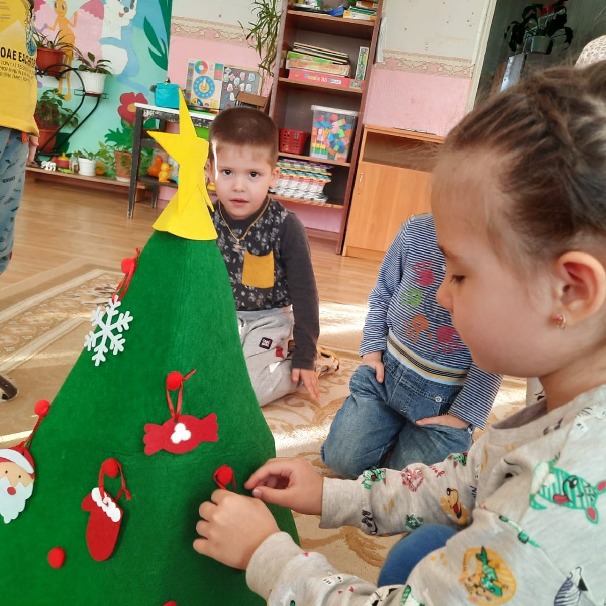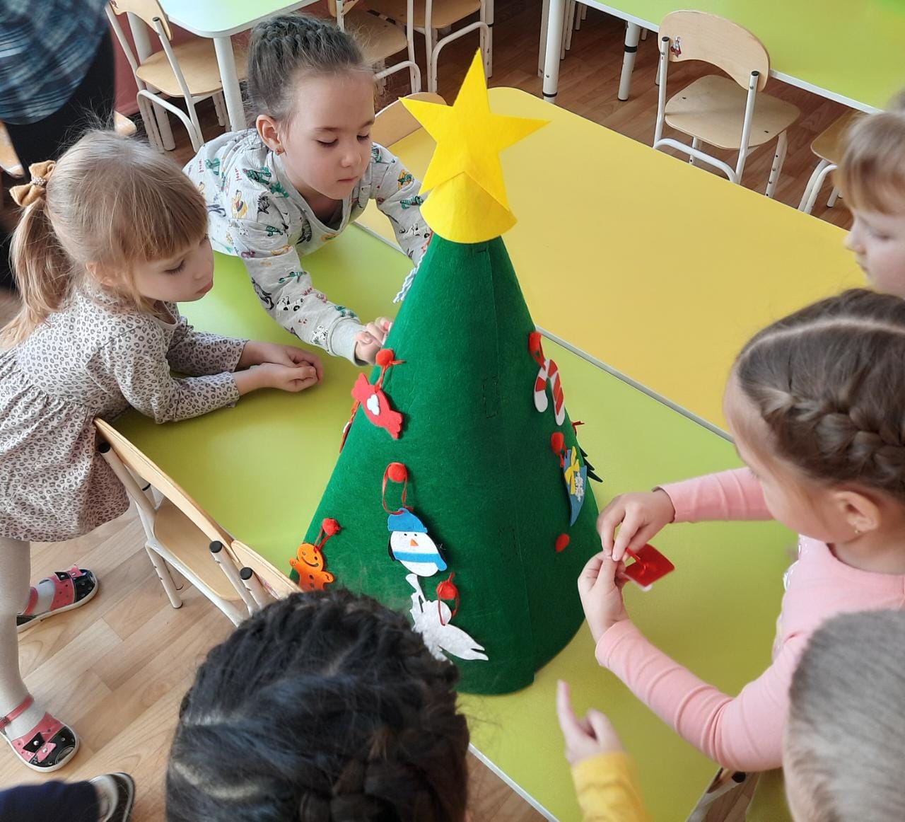 Дети с удовольствием приняли участие в украшении необычной фетровой и совсем неколючей Ёлочки-красавицы и изготовлении снежинок, которыми и украсили свою группу.