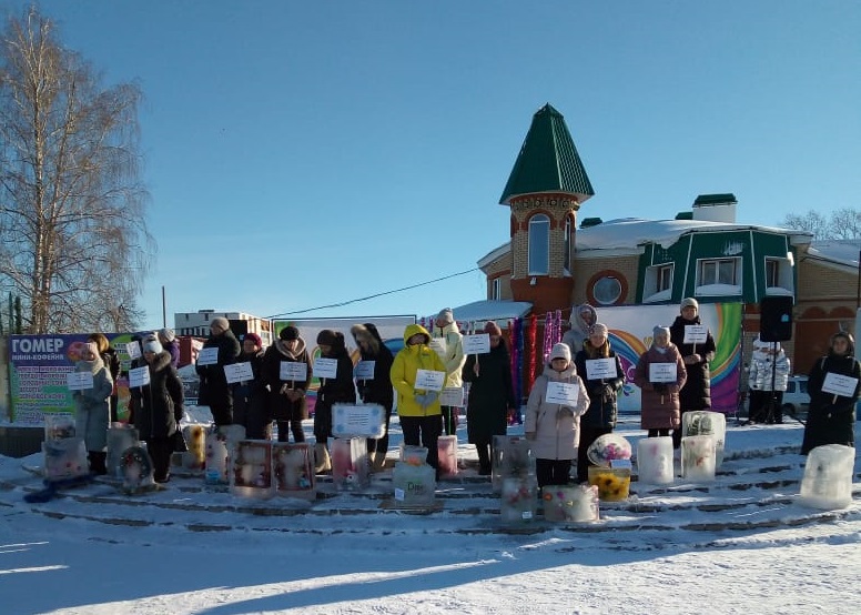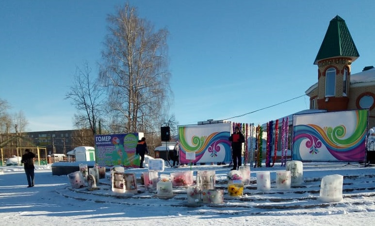 Каждое учреждение предоставило ледовую скульптуру, изготовленную заранее на своей территории. Тема композиции — новогодний букет в ледяной основе.