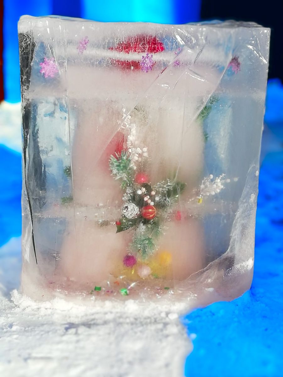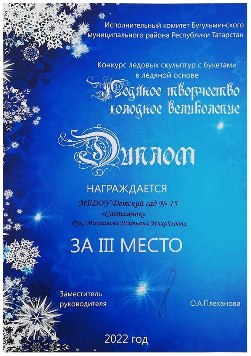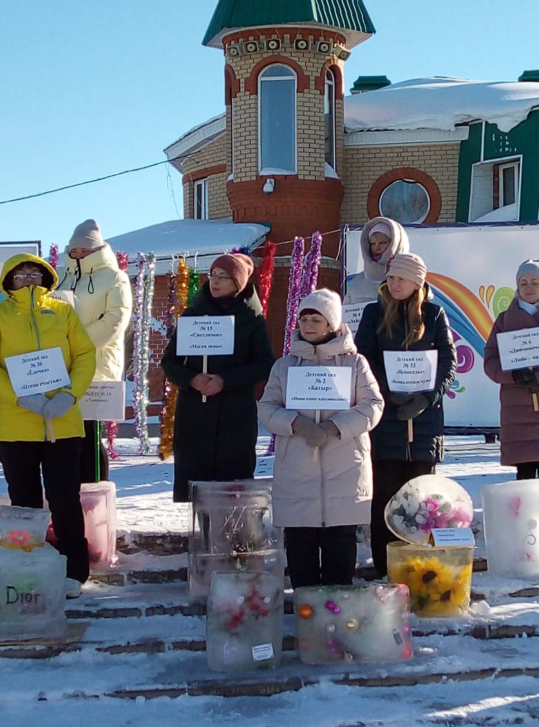 Представленная фигура изо льда высотой 60 сантиметров должна быть залита прозрачной водой, через которую хорошо бы просматривалась встроенная композиция. Прозрачность ледяной скульптуры — это особые технологии, достаточно трудоёмкий процесс, требующий определённых знаний и умений. Увы, не всем удалось добиться прозрачности и показать всю красоту творческих задумок. Наши педагоги татарских групп (Джамалова З. Х., Бадреева Э. И., Ганеева З. Г., Фаттахова Л. С.) представили на конкурс ледяную композицию "Магия зимы".