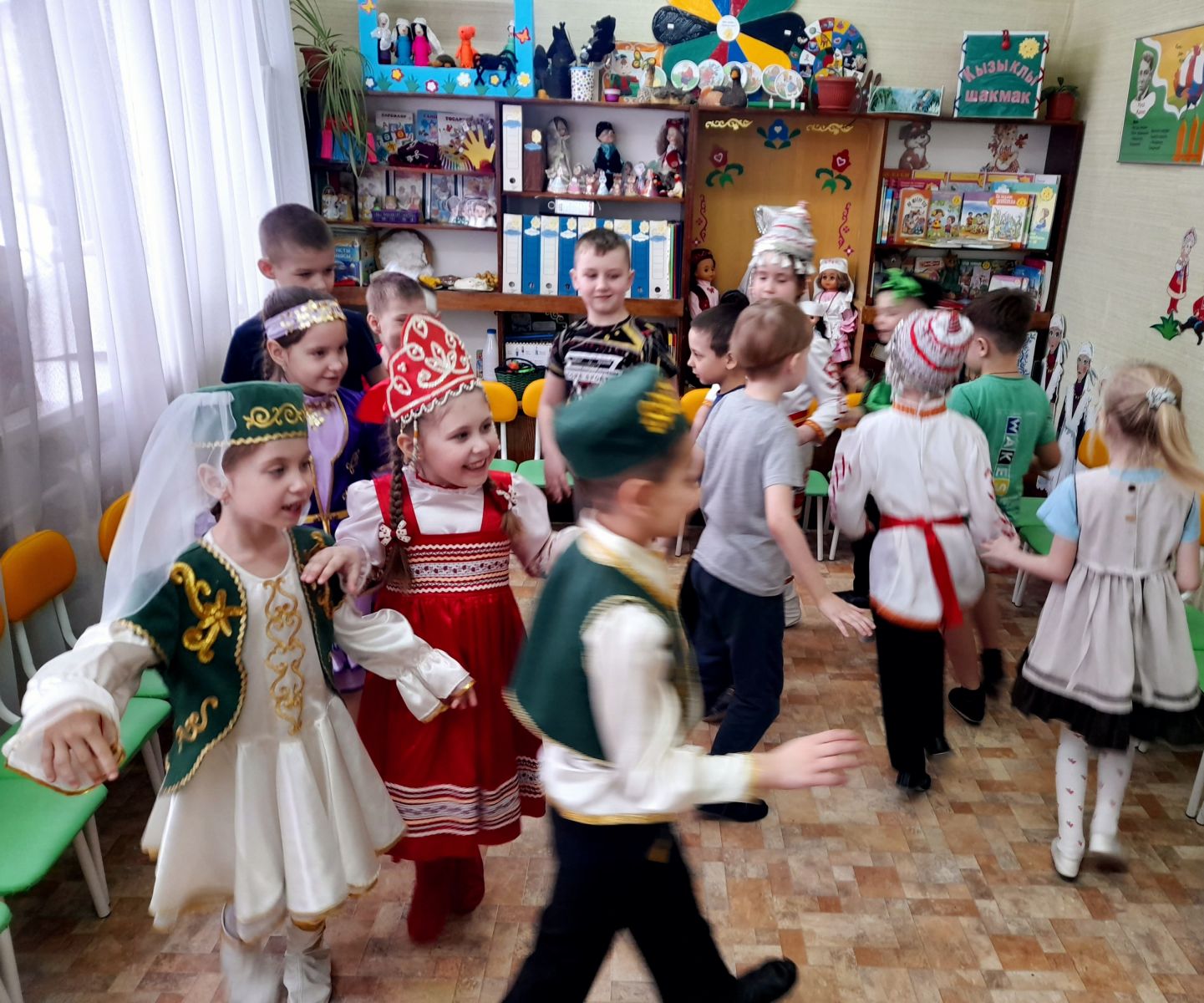 К детям на праздник пришли гости в национальных костюмах народов Поволжья. Ребята закрепили знания о различных предметах одежды, обуви, головных уборах; учились различать татарский, русский, башкирский, чувашский народные костюмы, выделяя их характерные элементы.