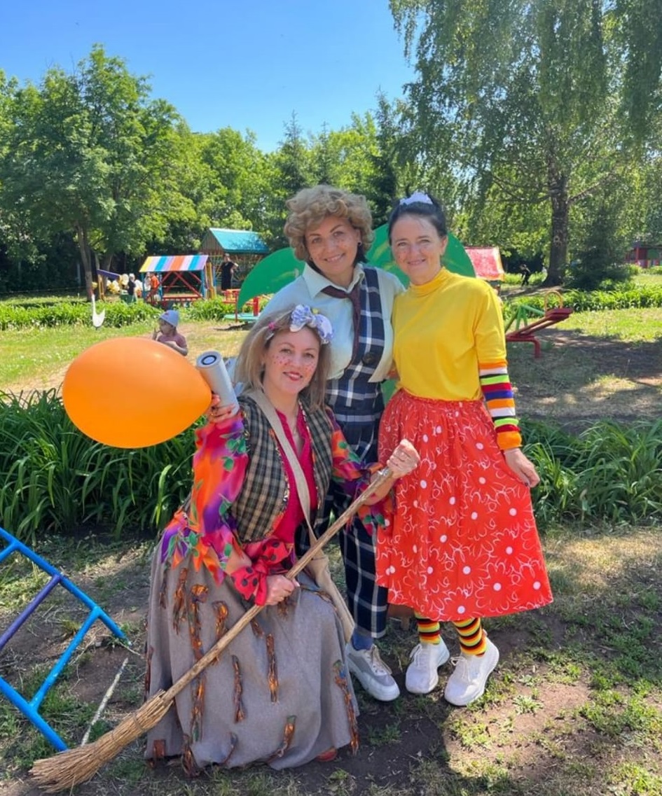 К детям в гости приходили Ириска (Тузилина Н. Н.), Карлсон (Бородино М. Н.) и развесёлая Баба-Яга (Андреевна А. В.), которые пели детские песни с ребятами, играли в забавные подвижные игры: "Весёлый бубен", "Метёлка волнуется — раз", "Не урони шарик".
