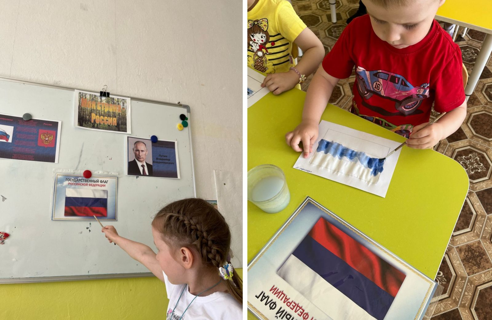 В средней группе "Солнышко" (воспитатели Деркач З.М., Бородина М.Н.) сегодня прошла творческая мастерская по изготовлению коллективной аппликации с элементами оригами "Флаг России — мой флаг".