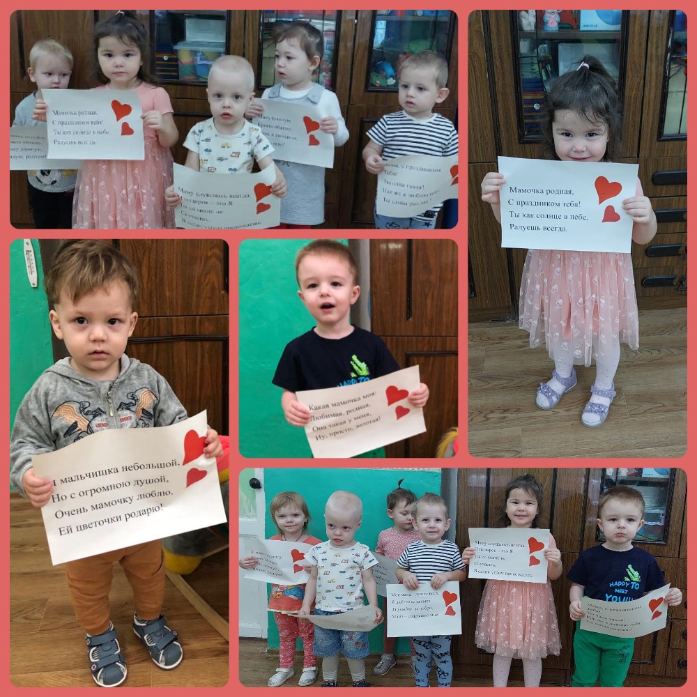В преддверии этого замечательного праздника дети группы «Капельки» (воспитатели Савина О.А., Моргачева Н.) тоже поздравили своих мамочек. Детки ещё маленькие, но они очень старались чтобы каждой маме было приятно их небольшое поздравление.