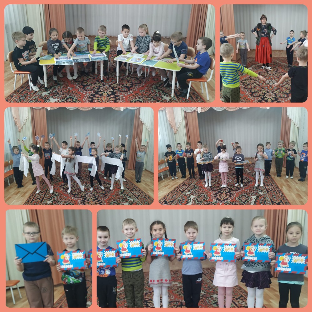 Слушая "Вальс снежных хлопьев" П.И.Чайковского, дети выбирали подходящие иллюстрации, импровизировали танцевальные движения с шарфиками и снежинками. А когда зазвучала пьеса М.Мусоргского "Избушка на курьих ножках", в гостиную пожаловала и сама Баба Яга.