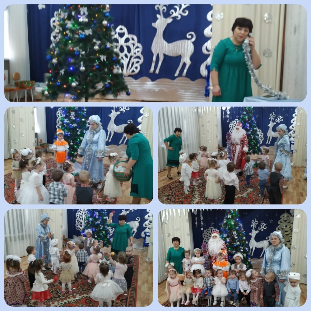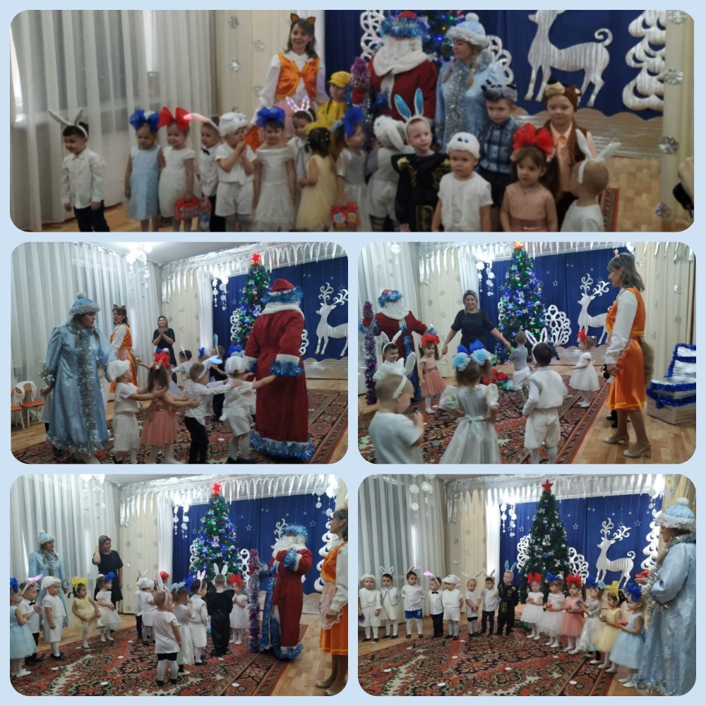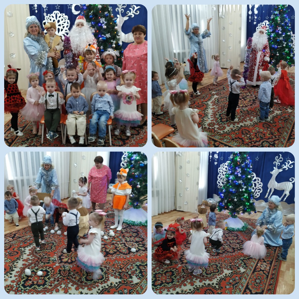 25.12.2023 г. Первыми к нарядно украшенной ёлочке пришли малыши групп "Капельки" и "Неваляшки". Новогоднее представление началось со встречи детей со Снегурочкой. Вместе они исполняли весёлые пляски, играли с ёлочными огоньками.