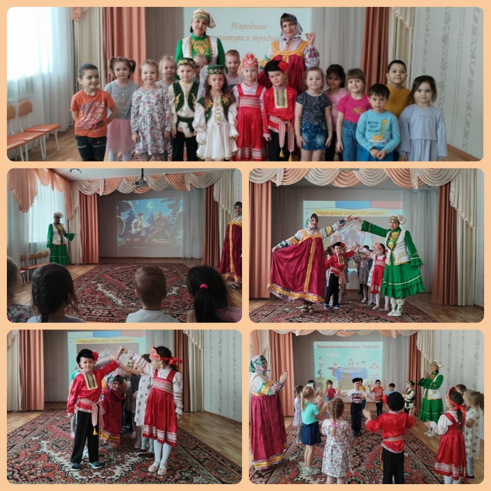 Дети с удовольствием отгадывали загадки,отвечали на вопросы о предметах быта, национальной одежды. Вспомнили и повторили русские и татарские народные сказки. Весело играли в русскую народную игру "Ручеёк" и татарскую народную игру "Тюбетей". А также показали свой талант игры на музыкальных инструментах в народном оркестре.