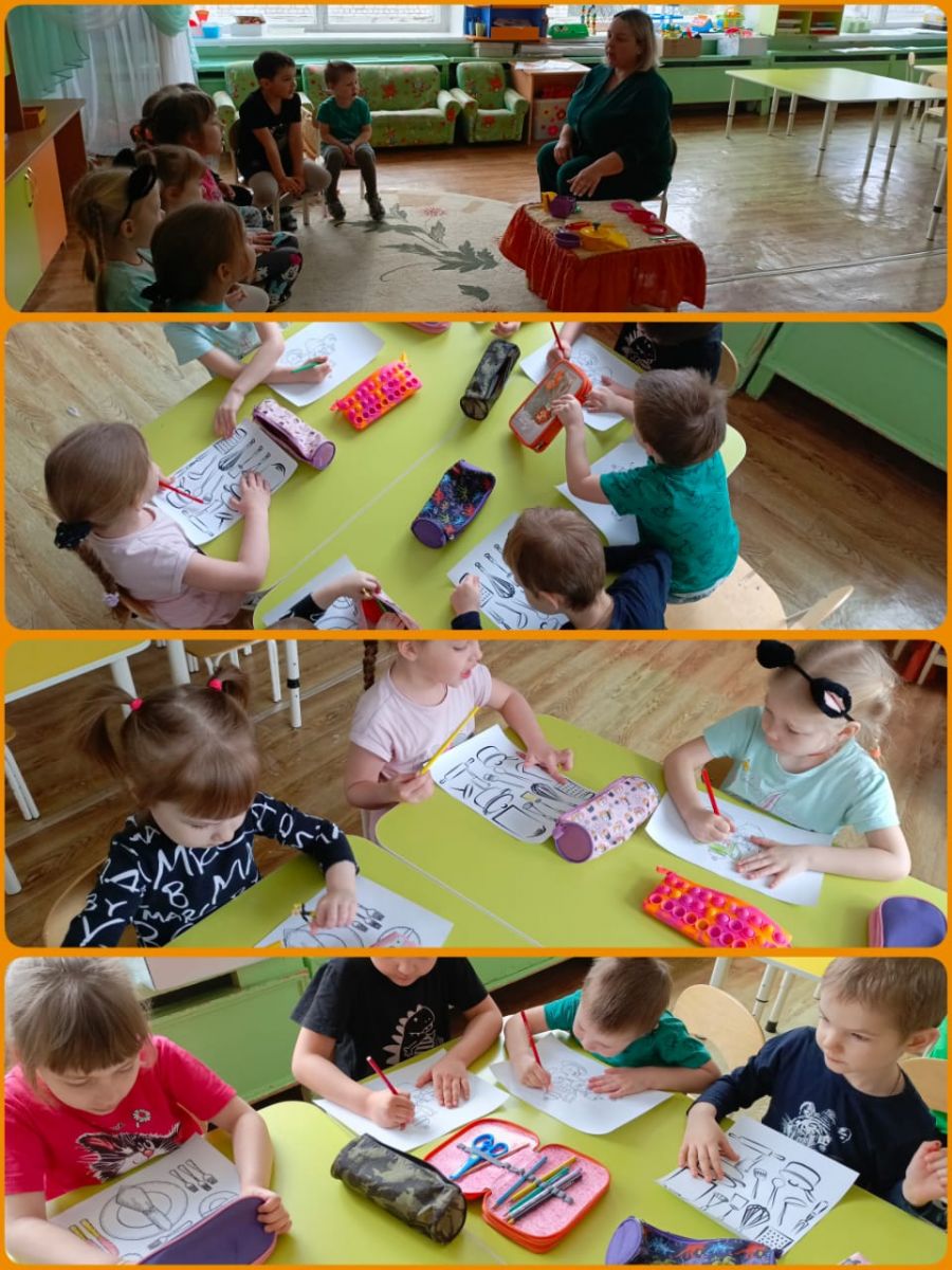 При беседе о посуде дети узнали, что посуда бывает трёх видов: чайная, столовая, кухонная. В закрепление беседы дети раскрасили раскраски.