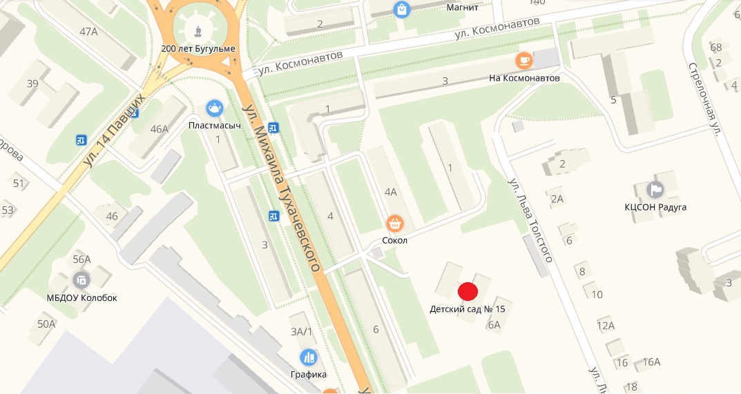 Полное наименование Учреждения на татарском языке: Татарстан Республикасы Бөгелмә муниципаль берәмлегенең мәктәпкәчә белем муниципаль бюджет учреждениесе балаларны һәрьяктан тәрбияләп үстерү буенча 15-нче “Светлячок” балалар бакчасы