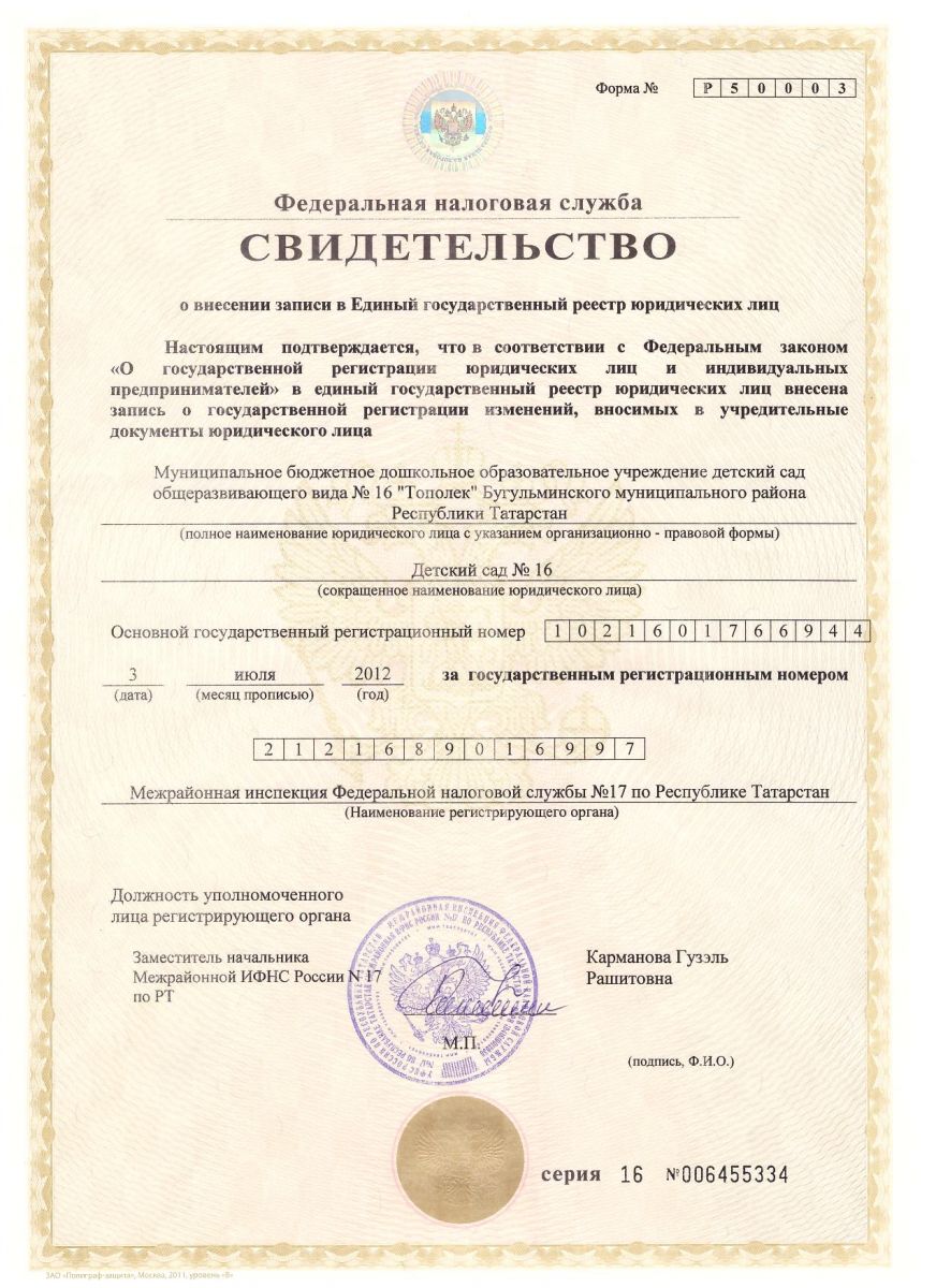 Муниципальное бюджетное дошкольное образовательное учреждение детский сад общеразвивающего вида №16 «Тополек» Бугульминского муниципального района Республики Татарстан