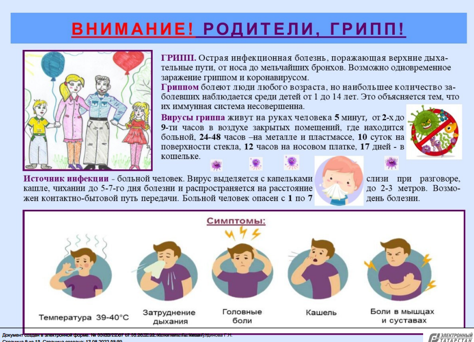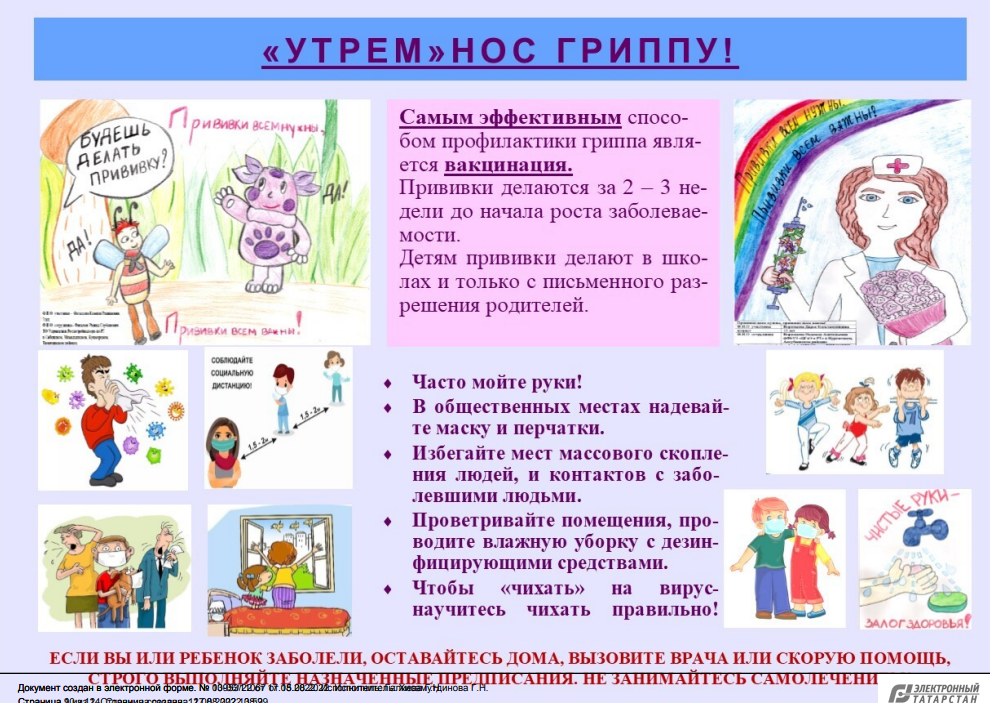 Уважаемые родители, с целью усиления информационной кампании по профилактике гриппа и COVID-19 в Республике Татарстан, а также в целях популяризации здорового образа жизни среди населения предлагаем Вам ознакомиться с памятками по профилактике гриппа и COVID-19, разработанные ФБУЗ «Центр гигиены и эпидемиологии в Республике Татарстан (Татарстан)», ФБУЗ «Центр гигиенического образования населения» Роспотребнадзора.