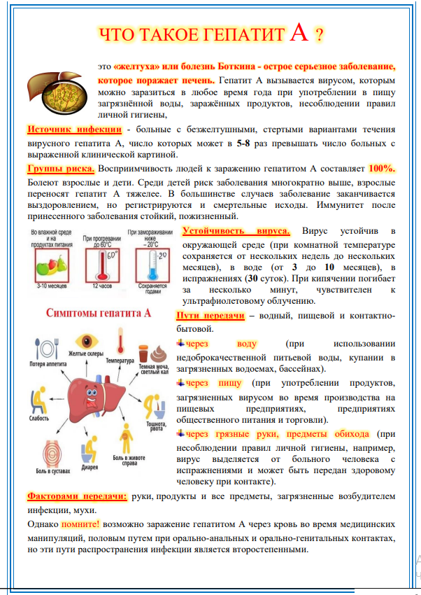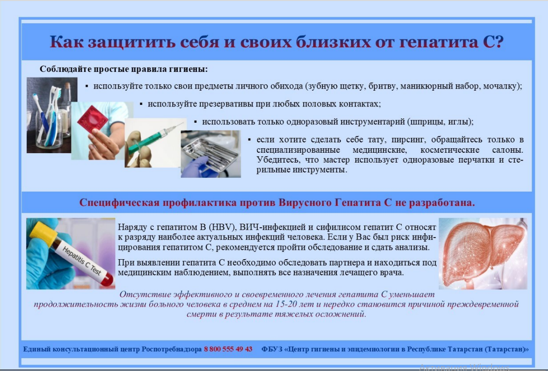 В рамках реализации памятной даты «28 июля – Всемирный день борьбы с гепатитом» и в целях популяризации здорового образа жизни среди населения предлагаем Вам ознакомиться с памятками по профилактике гепатитов А, В, С, Д, разработанные ФБУЗ «Центр гигиены и эпидемиологии в Республике Татарстан (Татарстан)», ФБУЗ «Центр гигиенического образования населения» Роспотребнадзора.