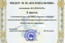 Наш детский сад занял почётное 1 место в муниципальном этапе Международного конкурса социальной рекламы антикоррупционной направленности "Вместе против коррупции!", в номинации "Календарь". Молодцы!!!