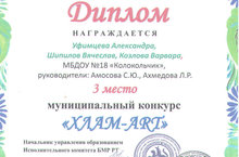 Муниципальный конкурс "ХЛАМ - АRT" 20.12.2019 Наши воспитанники Уфимцева Александра, Шипилов Вячеслав, Козлова Варвара (руководители: Амосова С.Ю. и Ахмедова Л.Р.) и педагог Файзуллина Г.Н. приняли активное участие в муниципальном конкурсе "ХЛАМ - АRT" и заняли почётные 3 места. Поздравляем!!!