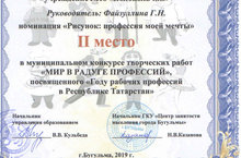 Муниципальный конкурс творческих работ "МИР В РАДУГЕ ПРОФЕССИЙ" 23.12.2019 Наши педагоги и воспитанник Коледин Егор приняли активное участие в муниципальном конкурсе творческих работ "МИР В РАДУГЕ ПРОФЕССИЙ" в Республике Татарстан и заняли почётные места. Поздравляем и желаем дальнейших творческих побед!