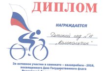 16 августа наши ребятишки приняли активное участие в самокато-велопробеге-2016, посвященном Дню Государственного флага Российской Федерации "Россия, вперед!" и были награждены дипломами. Поздравляем наших воспитанников!