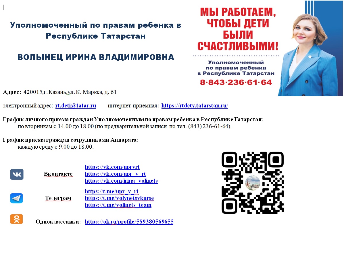 Уполномоченный по правам ребенка в Республике Татарстан ВОЛЫНЕЦ ИРИНА ВЛАДИМИРОВНА