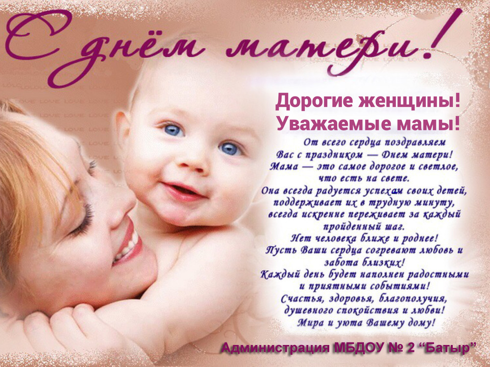 Дорогие мамы, этот день — прекрасный повод выразить Вам своё восхищение, любовь и уважение, преклониться перед Вашим чутким и отзывчивым материнским сердцем.