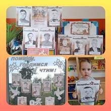 На протяжении десятилетий День Победы остаётся в России самым трогательным и душевным праздником. Никакие другие праздники не смогут сравниться с ним. В первой младшей группе №11 прошла акция "Помним, гордимся и чтим!" для развития общего кругозора и формирования чувства патриатизма. Воспитанники рассматривали фотографии своих прадедов, которые участвовали в ВОВ и слушали военно-патриотические песни. Для создания праздничного настроения оформлена развивающая среда в группе. В уголке для родителей подготовлен информационный проспект. -