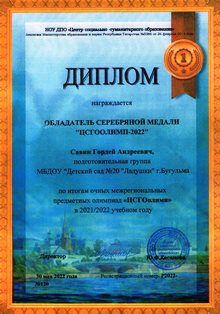 Поздравляем Савина Гордея, воспитанника подготовительной группы № 14 (воспитатели: Кудряшова А.В. и Степанищева Т.В.). Гордей стал обладателем серебряной медали "ЦСГООЛИМП-2022" по итогам очных межрегиональных предметных олимпиад "ЦГСОлимп" в 2021/2022 учебном году. Желаем успехов и дальнейших побед!!! -