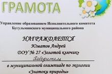 Поздравляем воспитанника подготовительной к школе группы №1 Юматова Андрея с победой в муниципальной олимпиаде по экологии "Знатоки природы". Желаем дальнейших побед, достижений и новых высот!