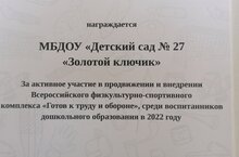 Наш детский сад отмечен благодарственным письмом от Исполнительного комитета Бугульминского муниципального района за активное участие в продвижении и внедрении Всероссийского физкультурно - спортивного комплекса "Готов к труду и обороне", среди воспитанников дошкольного образования в 2022 году.