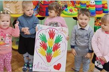 В младшей группе педагоги провели с детьми беседу о том, кто такие пожилые люди (бабушки и дедушки). Пояснили воспитанникам, что пожилым людям нужно помогать, любить и уважительно относиться. Дети совместно с воспитателями сделали поздравительную открытку. Разноцветные ладошки, вырезанные из цветной бумаги, были оформлены в виде осеннего букета.