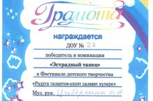 В Центре татарскорй культуры прошел фестиваль детского творчества "Радуга талантов - сәләт салават күпере" Наши дети приняли участие в двух номинациях татарский танец и эстрадный танец. По итогам фестиваля мы стали победителями в номинации "Эстрадный танец" музыкальный руководитель Циберкина Ольга Александровна. Поздравляем!!!