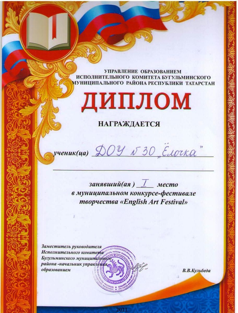 Опубликовано: 10.03.2021Наш детский сад ориентирован на развитие личности ребенка в системе дополнительного образования. Шакирзянова Лилия Камилевна является руководителем дополнительной образовательной услуги по обучению детей английскому языку “Happy English” на протяжении 10 лет. Дети ДОУ становились победителями муниципальной детской олимпиады «Я говорю по-английски» - 2018г., 2019г. В этом году наши воспитанники заняли первое место в муниципальном конкурсе-фестивале творчества “English Art Festival” с песней “Twinkle, twinkle, little star”.
