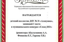 Наш детский сад принял участие в муниципальном конкурсе «Сәхнә-2021» и стал победителем. Поздравляем наших маленьких артистов с 1 местом!!!