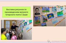 Бүген, 26 апрель көнне, безнең балалар бакчасында бөек татар шагыйре Г.Тукайның әсәрләре буенча рәсем күргәзмәсе оештырылды. Тәрбияче Габидуллина Наҗия Равил кызы уртанчылар төркеме тәрбияләнүчеләренә шагыйрьнең биографиясе һәм иҗаты турында сөйләде, мультфильм күрсәтте һәм балаларны рәсемнәр күргәзмәсе белән таныштырды. Балалар зур кызыксыну белән тәрбиячене тыңладылар һәм аннан соң зурлар төркеме тәрбияләнүчеләренең рәсемнәрен карадылар. Алар яраткан мультфильм һәм әкият геройларын таныдылар, әсәрләрнең исемнәрен әйттеләр.