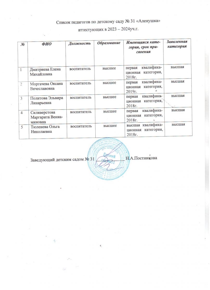 Список педагогов по детскому саду № 31 «Аленушка», аттестующихся в 2023 – 2024 учебном году
