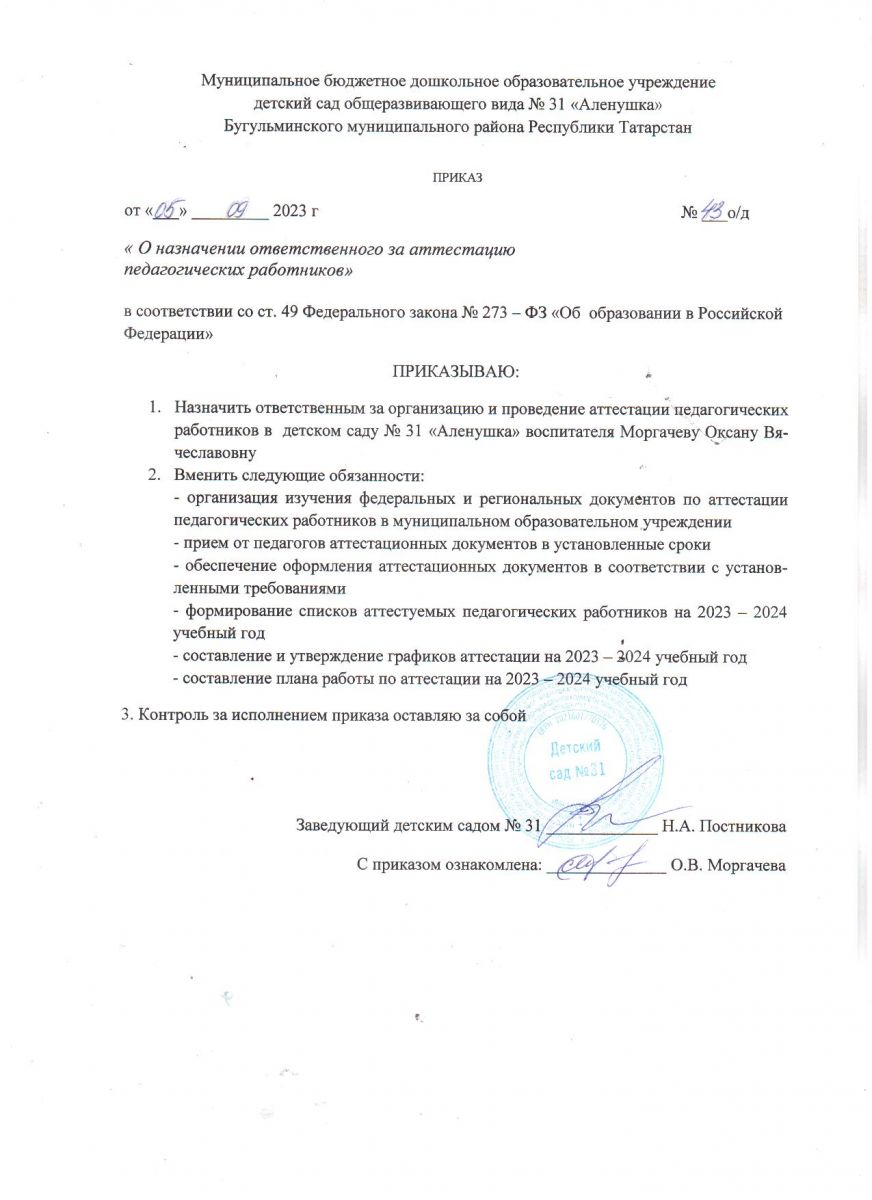 Приказ "О назначении ответственного за аттестацию педагогических работников"