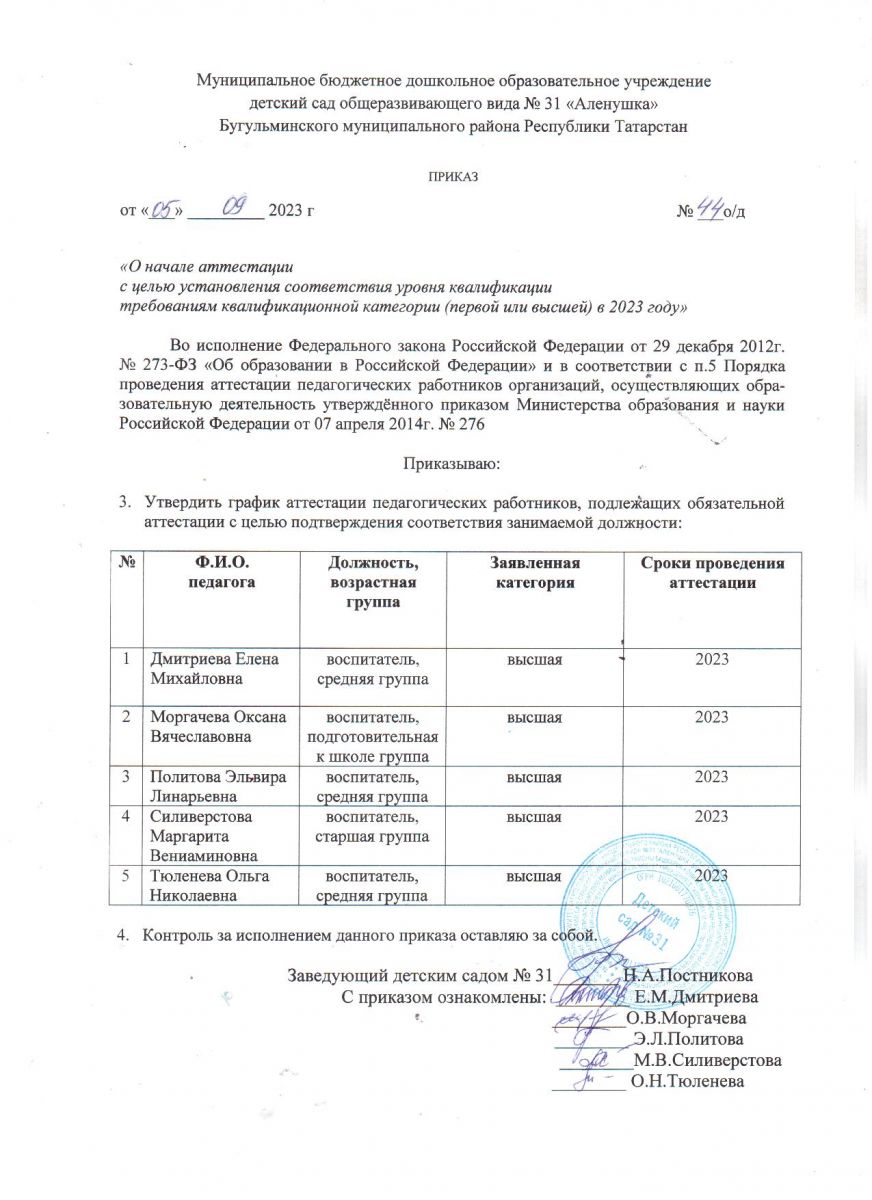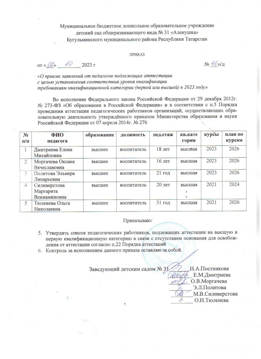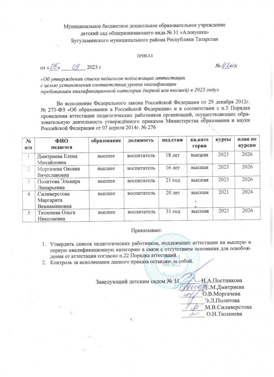 Приказ «Об утверждении списка педагогов, подлежащих аттестации на первую категорию в 2023 году»