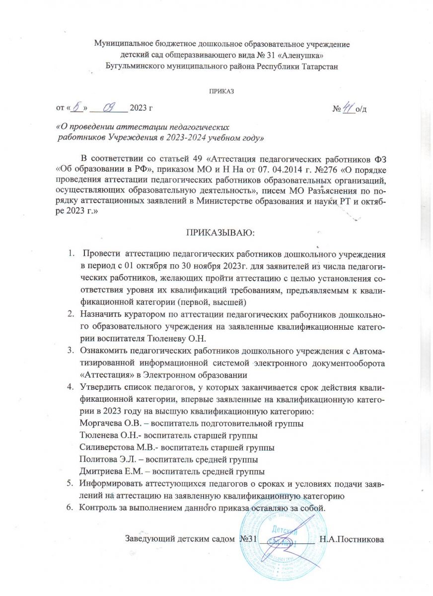 Приказ «О проведении аттестации педагогических работников Учреждения в 2023 – 2024 учебном году»
