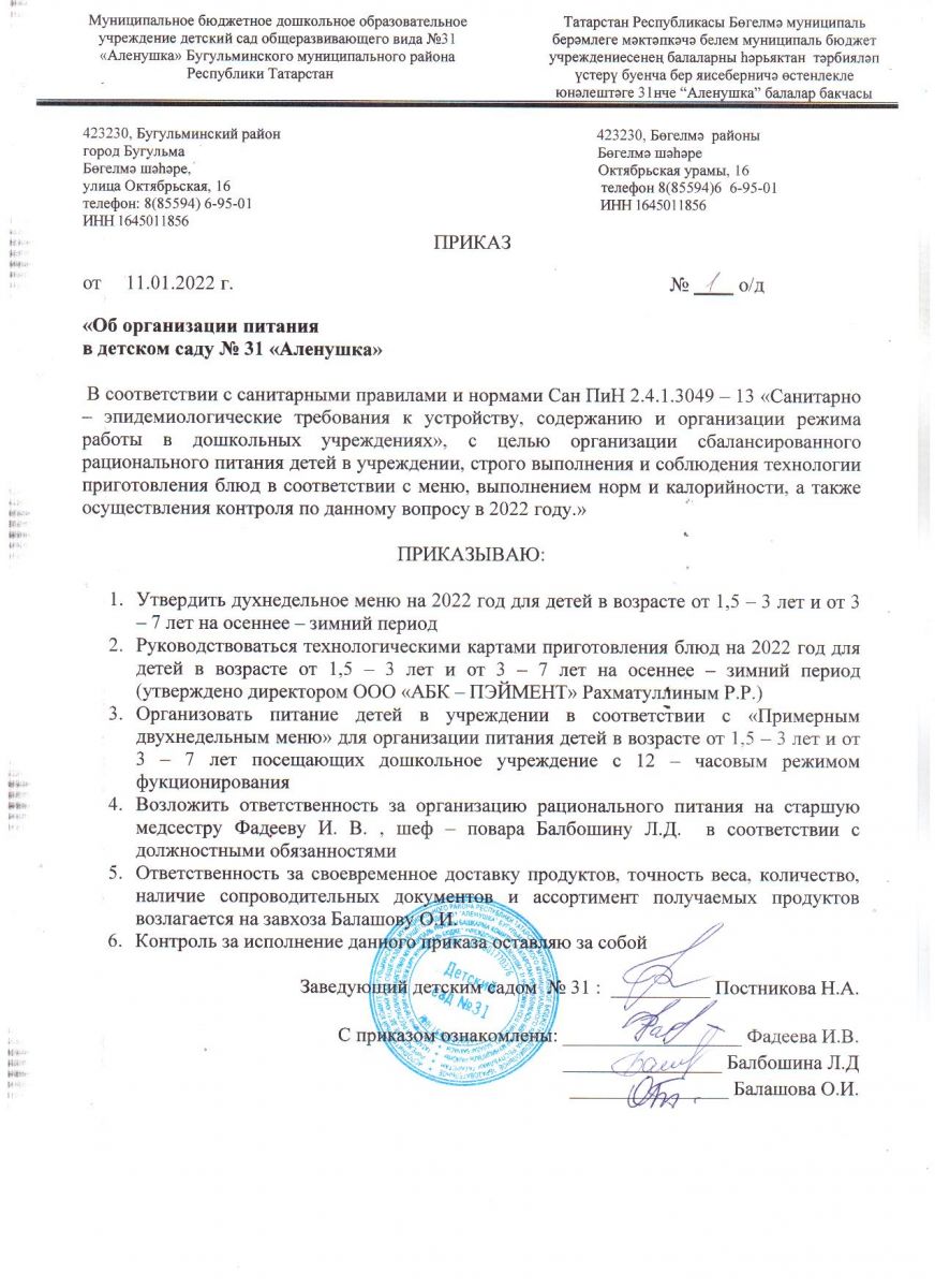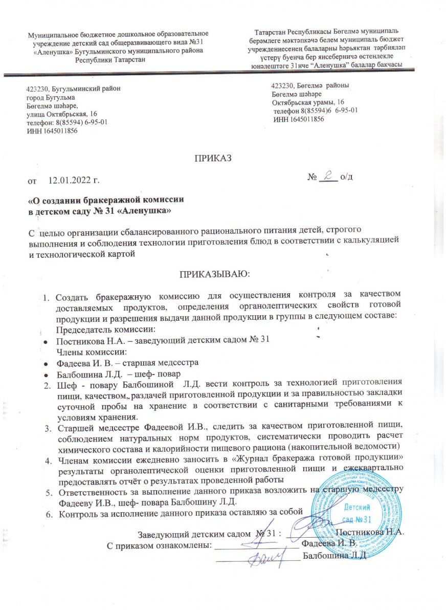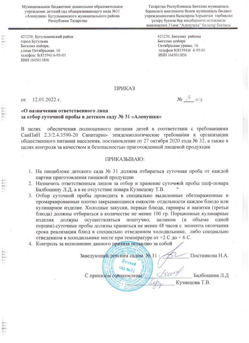 Приказ о назначении ответственного лица за отбор суточной пробы