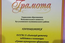 Наш детский сад был награжден грамотой победителя в номинации «Лучшее музыкальное оформление» в муниципальном смотре-конкурсе детских театров «Сайяр». Руководители: Гареева Рамиля.Асгатовна, Гарипова Таскира Юсуповна, музыкальный руководитель: Соколова Аделя Рамилевна.